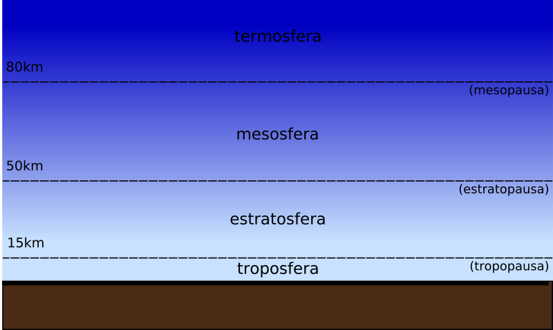 Es la capa que se encuentra entre los 12 y los 90 km de altura. Los gases se encuentran separados formando capas o estratos de acuerdo a su peso. Una de ellas es la capa de ozono que protege a la Tierra del exceso de rayos ultravioletas provenientes del Sol. Las cantidades de oxígeno y anhídrido carbónico son casi nulas y aumenta la proporción de hidrógeno. Actúa como regulador de la temperatura, siendo en su parte inferior cercana a los -60ºC aumentando con la altura hasta los 10 ó 17ºC en la estratopausa.