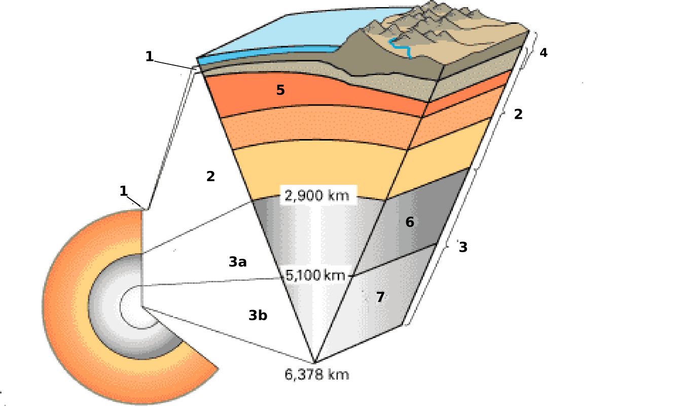 1=地殻; 2=マントル; 3a=外核; 3b=内核; 4=リソスフェア; 5=アセノスフェア