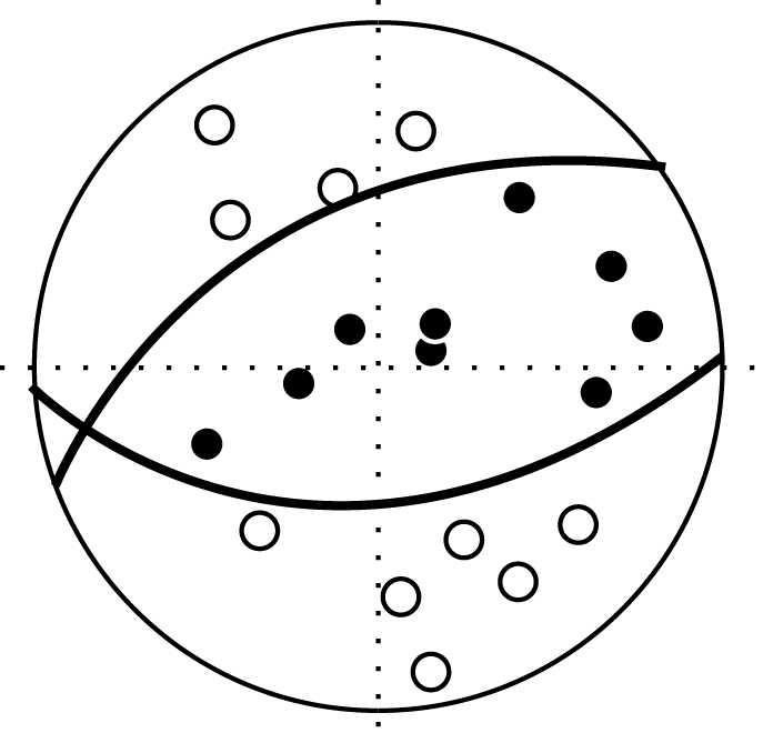 地震のメカニズム解(発震機構解)の図。地震計の観測結果を基に図に表し、断層の位置や動いた方向を解析する。
